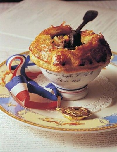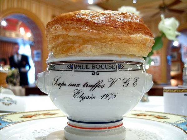 看完了享用的要點,在此也要舉幾道利用松露入菜而聞名世界的例子。我的校長-保羅包庫斯Paul Bocuse先生,至今維持米其林三星最長紀錄保持者,法國料理界的教皇級人物。當年他獻給法國總統季斯卡的一道菜,就是以牛肉清湯為基底,加入當季蔬菜與肥肝,再放入松露,最後用酥皮密封入烤箱烘烤。上桌時再由客人自行敲破酥皮,此時松露的香氣隨著熱氣一擁而上,迎面而來的奇香在鼻腔中不斷的縈繞著,如此掌握松露特性所研發出的料理,果然一舉成名蔚為經典。